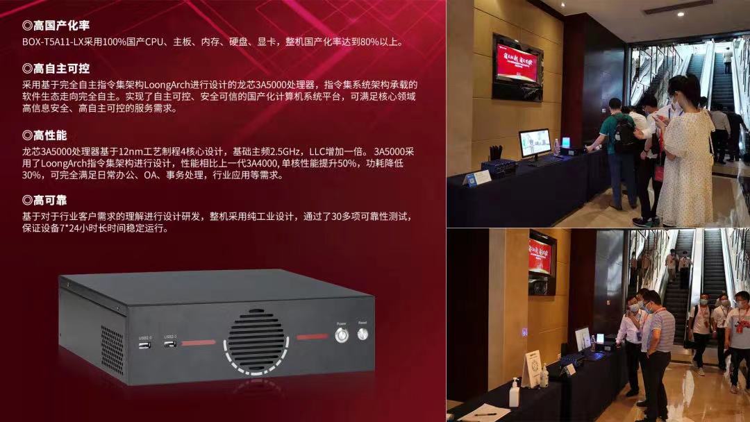 此次發布會上,研恒科技推出了基于龍芯新一代處理器龍芯3A5000設計研發的微型計算機BOX-T5A11-LX。龍芯3A5000采用完全自主指令集架構LoongArch進行設計,所承載的軟件生態走向完全自主,性能相比上一代3A4000, 單核性能提升50%,功耗降低30%。BOX-T5A11-LX整機采用純工業設計,通過了30多項可靠性測試,保證設備7*24小時長時間穩定運行。配套國產BIOS,加載國產操作系統和國產基礎應用軟件,實現自主可控、 安全可信的自主化計算機系統平臺,可滿足日常辦公、 OA、事務處理,行業應用等多種場景需求,適用于政企、安全、金融、能源、交通、教育及重點行業信息化等領域。