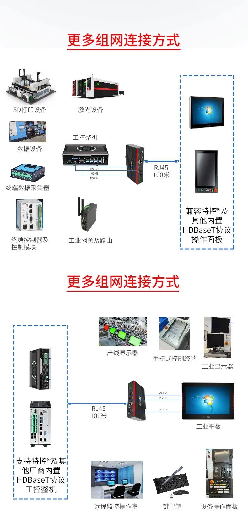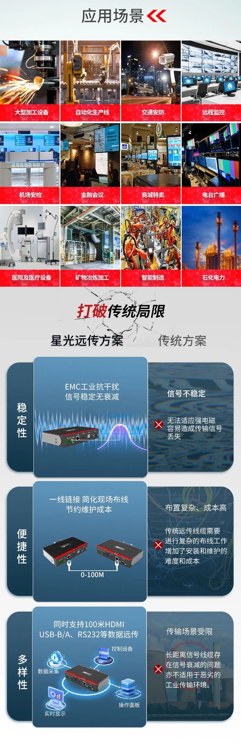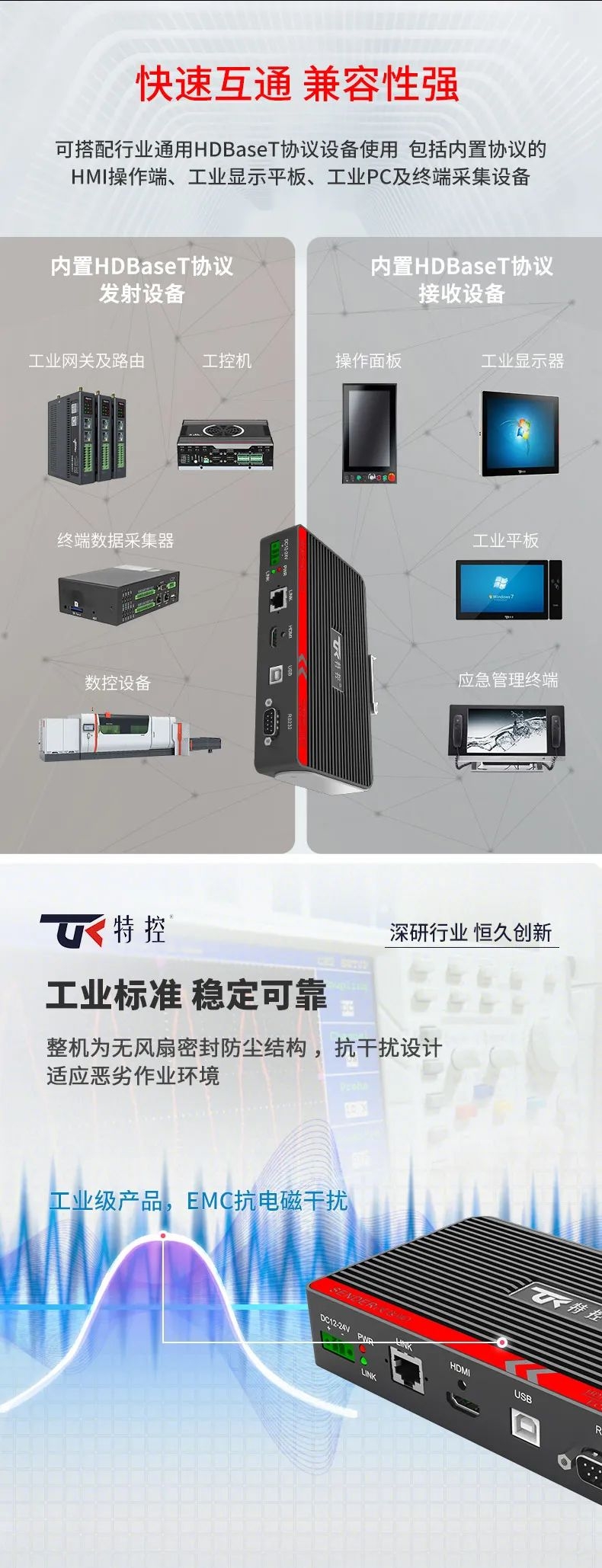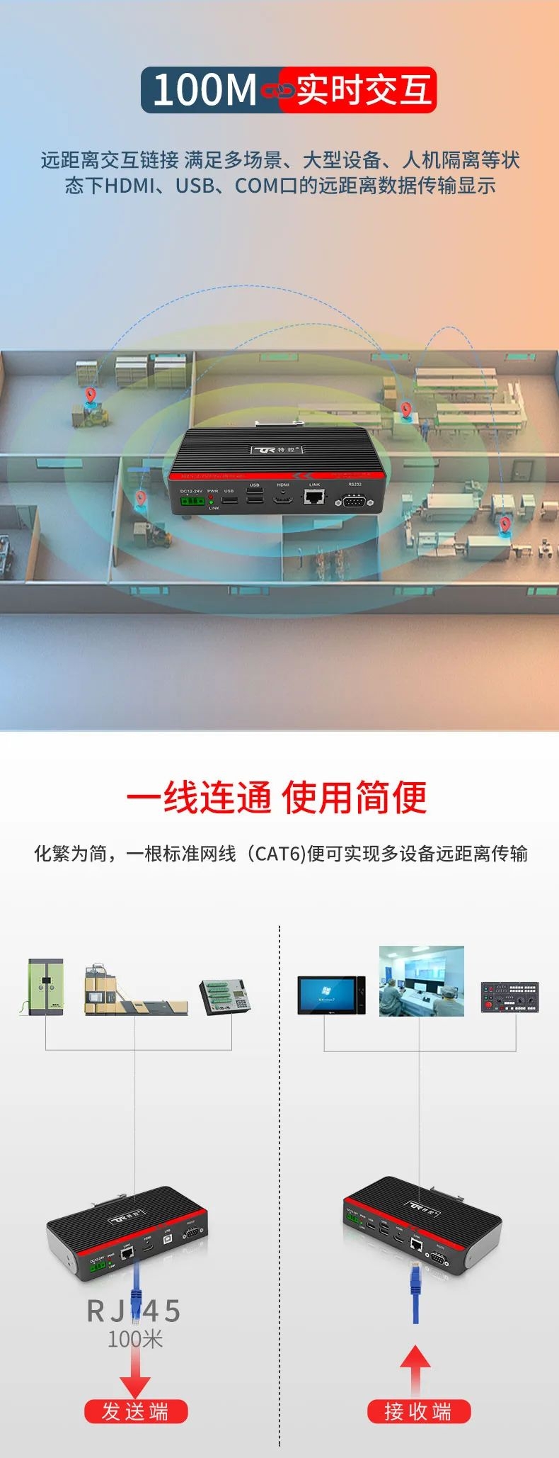 在大型裝備、自動化產(chǎn)線、激光及數(shù)控行業(yè)等需要遠距離信號傳輸場景中,傳統(tǒng)HDMI線纜存在信號衰減、傳輸距離限制、布線不便等問題,這極大地影響顯示端的成像質(zhì)量和雙向數(shù)據(jù)的穩(wěn)定性和時效性。為此,特控研發(fā)出抗干擾性強、數(shù)據(jù)零延時、兼容性強的HDMI星光遠傳ECU-TR12。
