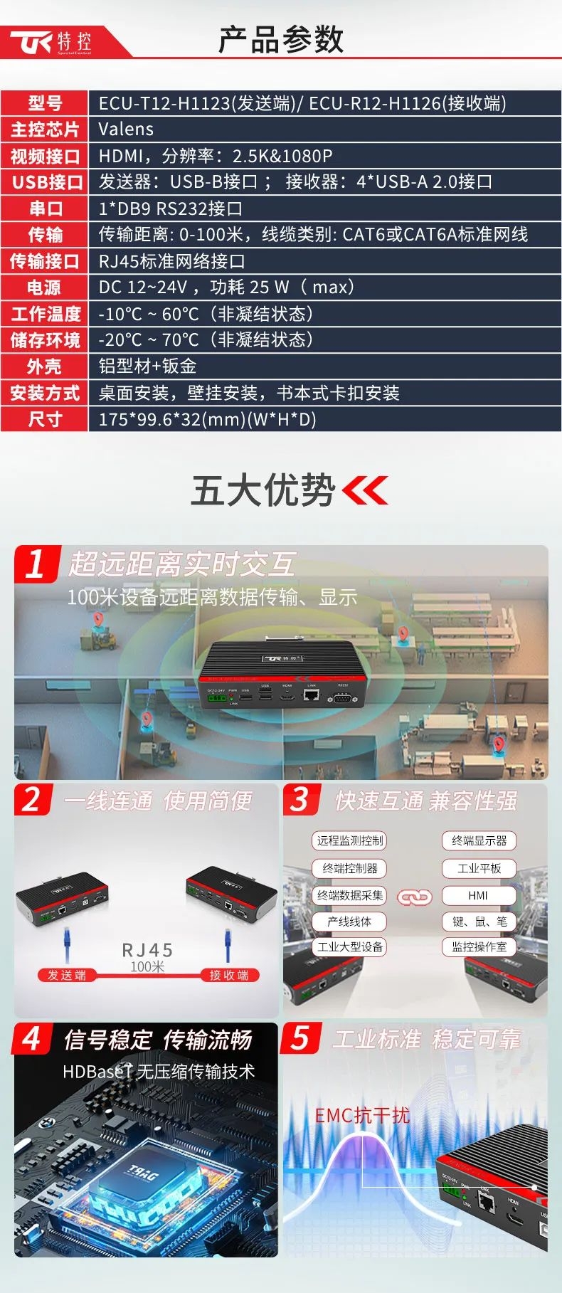 特控ECU-TR12采用進口高性能芯片設(shè)計,總體由發(fā)射端T12和接收端R12兩部分組成,發(fā)射端可將2.5k高清視頻信號、USB和RS232數(shù)據(jù)信號進行整合,通過標(biāo)準(zhǔn)網(wǎng)線(CAT6)遠距離傳輸?shù)浇邮斩耍瑹o信號衰減,接收端通過高性能智能芯片解碼,可以給用戶高速高質(zhì)量的數(shù)據(jù)及顯示交互體驗,整機外殼采用鋁合金散熱設(shè)計,機身堅固小巧獨具工業(yè)美感,可搭配行業(yè)通用HDBeasT協(xié)議設(shè)備使用,包括內(nèi)置協(xié)議的HMI操作端、工業(yè)顯示平板、工業(yè)PC及終端采集設(shè)備。